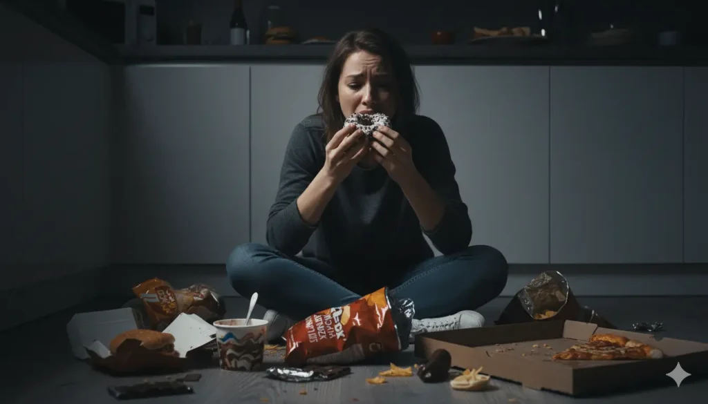 Le rythme de consommation devient accéléré, presque automatique, sans réflexion sur la quantité avalée. Une sensation de vide, de honte ou de malaise apparaît juste après l’épisode, créant un profond inconfort. Ce comportement se distingue clairement d’un simple excès par son caractère impulsif et irrépressible.