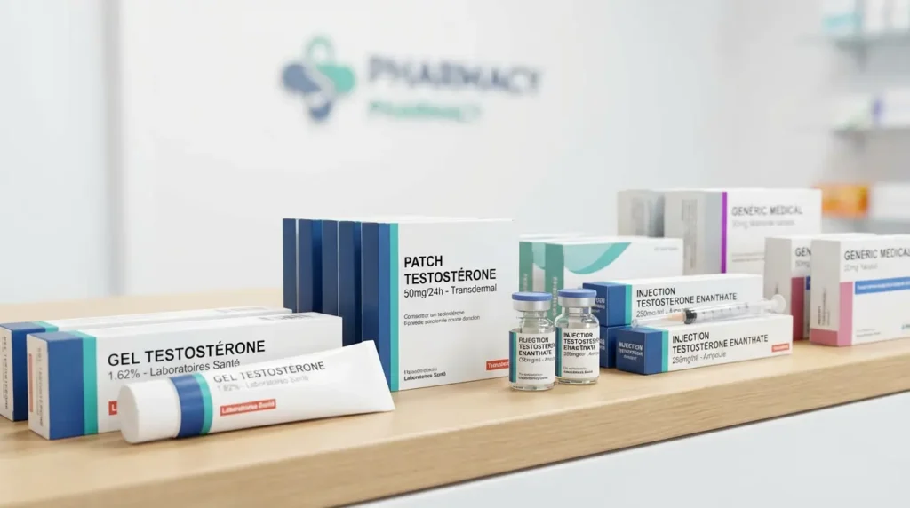 Les médicaments comme Androtardyl 250 mg (injection intramusculaire), Androgel 16,2 mg/g (gel transdermique) ou Nebido 1000 mg (solution injectable) nécessitent tous une prescription initiale restreinte et un suivi médical régulier. Les alternatives légales disponibles sans ordonnance comprennent les boosters naturels de testostérone (tribulus terrestris, maca du Pérou, fenugrec, ginseng, zinc, vitamine D) vendus en pharmacie, parapharmacie et magasins spécialisés nutrition.